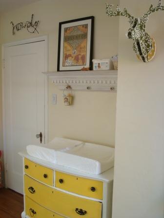 The dresser/changing table was definitely the most challenging of the furniture pieces. I loved its height and the shape of its legs, but it was from the home of a serious smoker. After scrubbing/primering/painting the whole thing to eliminate the smell and replacing some of the hardware, I feel that the $65 we paid was a little steep for all the work that went into it. I still love how it looks, though.