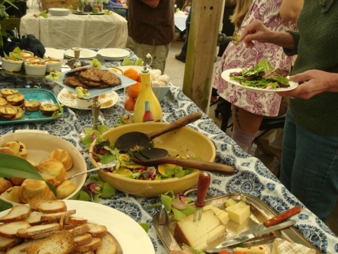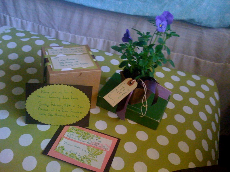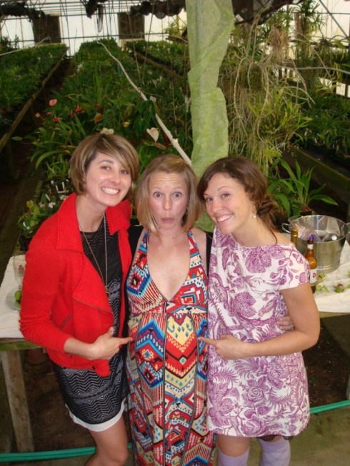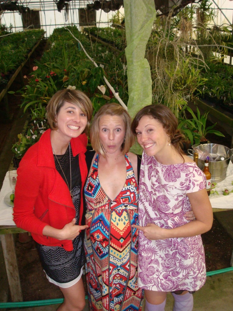 Those girls – they are so clever. The shower was held at an orchid nursery and had this cozy, rustic, homespun-yet-hip vibe to it. Jenny is a foodie extraordinaire, so the food was brilliant: brioche, salads, a cheese board, pomegranate punch, and – made special for the pregnant girl – chocolate-covered bacon. Yum.