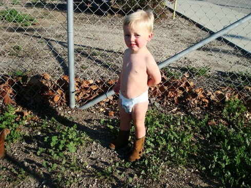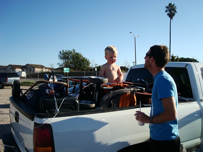 I went into the In-N-Out Burger to pee and wash my hands of traveling grime while Jake stayed behind with the truck.  You see, we borrowed a friend’s truck to haul back a dining table and chairs we inherited.  Since we had the truck, Jake decided to load up on some other fun items like his dad’s old belt sander and hand truck. All of these were rather precariously secured with duct tape and dental floss in the truck bed, so someone had to stay behind wherever we stopped.  When I returned, the child I had dressed for mountain snow just that morning was stripped down to nothing but baby cowboy boots and a diaper.  Welcome to California, land of diverse weather and freaky road-tripping families.