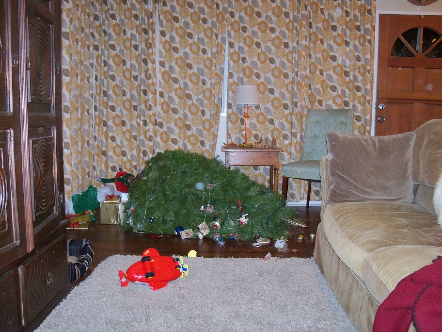 Actually, the scene I walked into this morning can’t be blamed on Seabass. He was an innocent bystander. No, this was the fault of our pathetically underperforming Christmas tree stand: You know, the one we bought for something like $0.75 ten years ago at a Rite Aid in Berkeley, swearing we’d buy a “real” one next year and next year and next year? Yup, that’s the one.