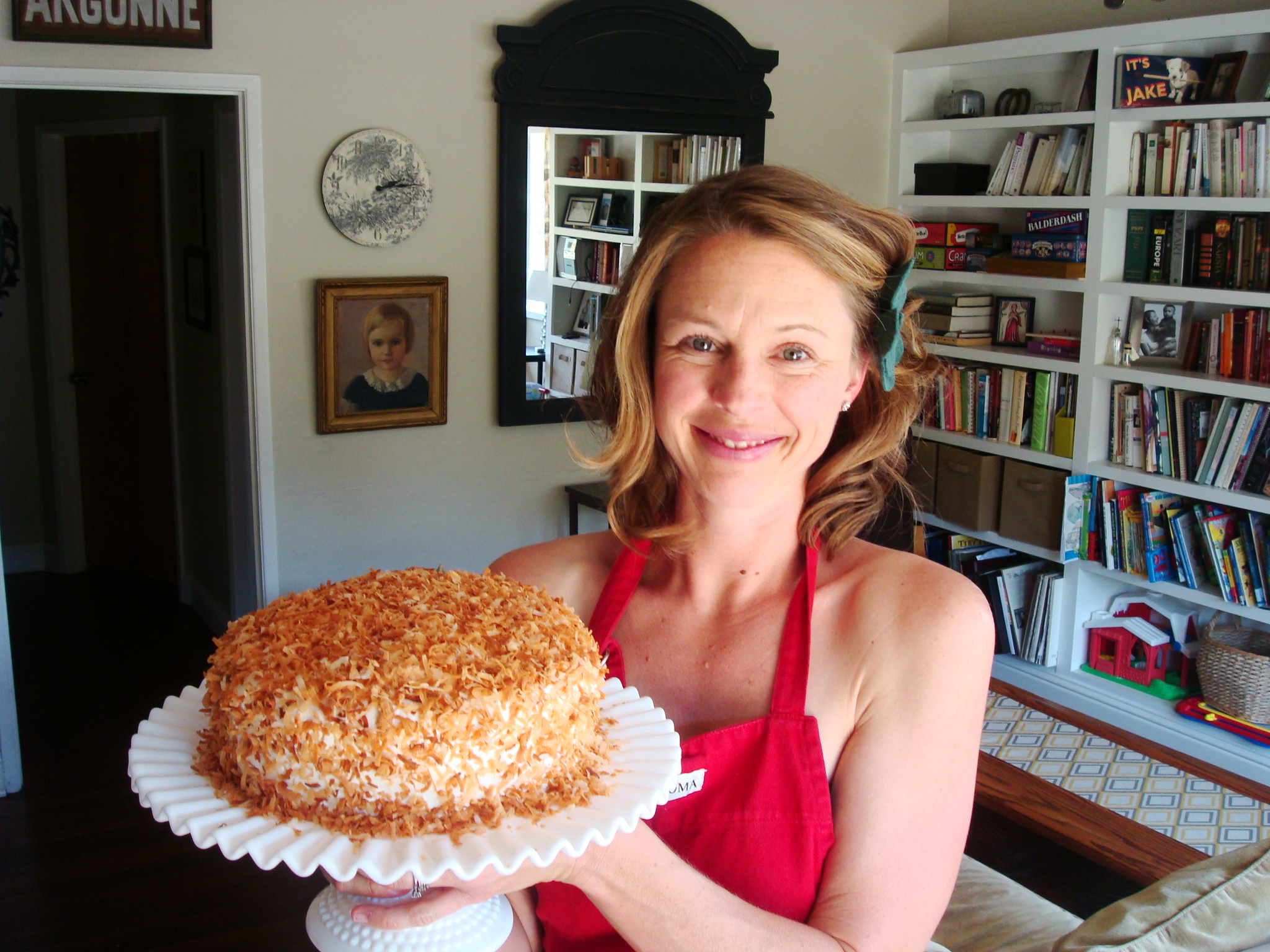 This is probably my favorite cake in the whole world – coconut cake – and I swear I *am* wearing clothes under my apron. Ah, the hazards of a strapless dress.